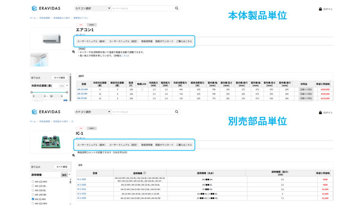 本体製品シリーズ、型番単位そして、別売部品単位で付随資料やデータを管理・提供することが可能です。