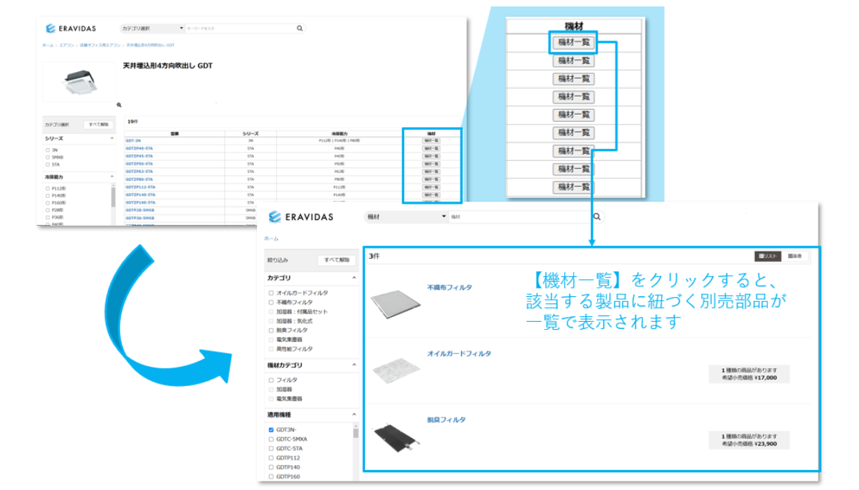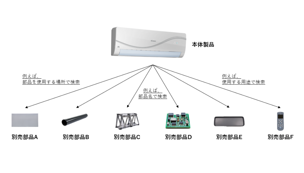 詳しくはこちら トテキストテキストテキストテキストテキストテキストテキストテキストテキスト 本体製品に紐づく「別売部品」を様々な条件で検索できるようになります。 ユーザーや代理店は使用している本体製品が分かれば、 別売部 品を簡単に特定できるようになります。