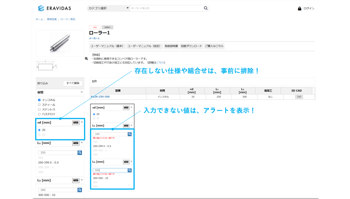 B2B製造業に特化したWebCMS 「ERAVIDAS」は、Web上でたくさんの製品の情報提供をする必要があるB2B製造業の 情報発信を支援するシステムです。 自社の商品マスタをERAVIDASにアップロードするだけで、ユーザーが必要とする商品選定機能・製品ページ・資料提供機能をもったサイトを構築することが可能です。 豊富な機能と運用支援で製品情報提供の業務を効率化 し、Web上で優れたユーザー体験 をご提供します。