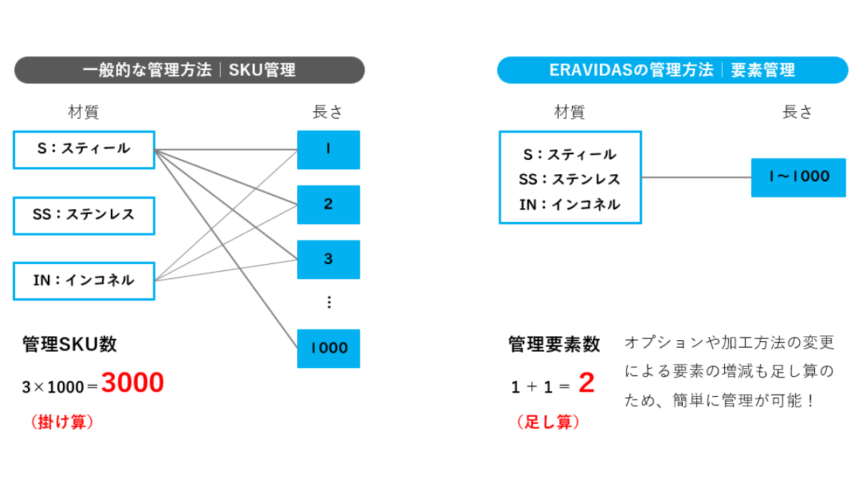 03 要素管理 のため、情報が少なく、管理が簡単 ! 要素単位で管理するため、要素の数だけ足し算で管理することが可能。 オプションの追加や加工方法の変更による、要素の増減も足し算のため簡単に行うことができます。